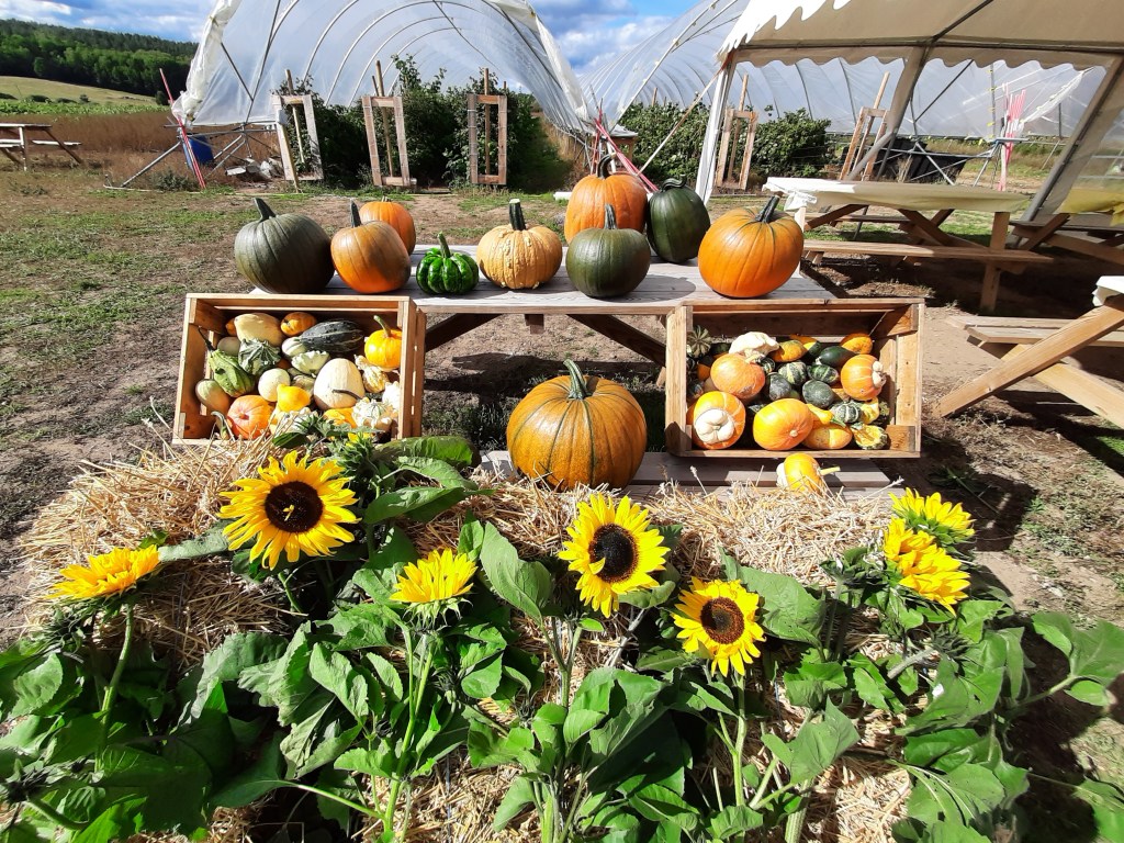 Plocka pumpor, majs, hallon, jordgubbar, björnbär, vinbär och solrosor!